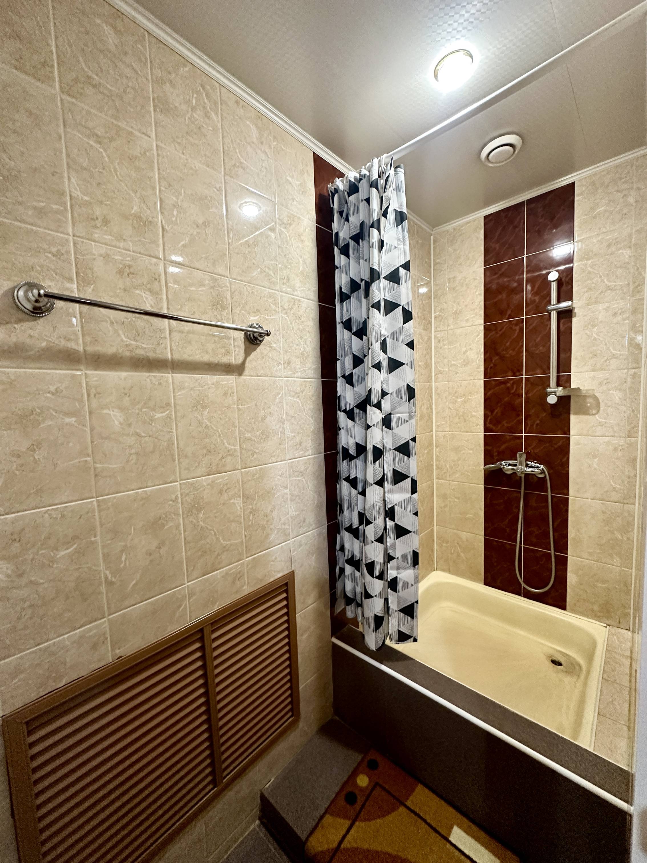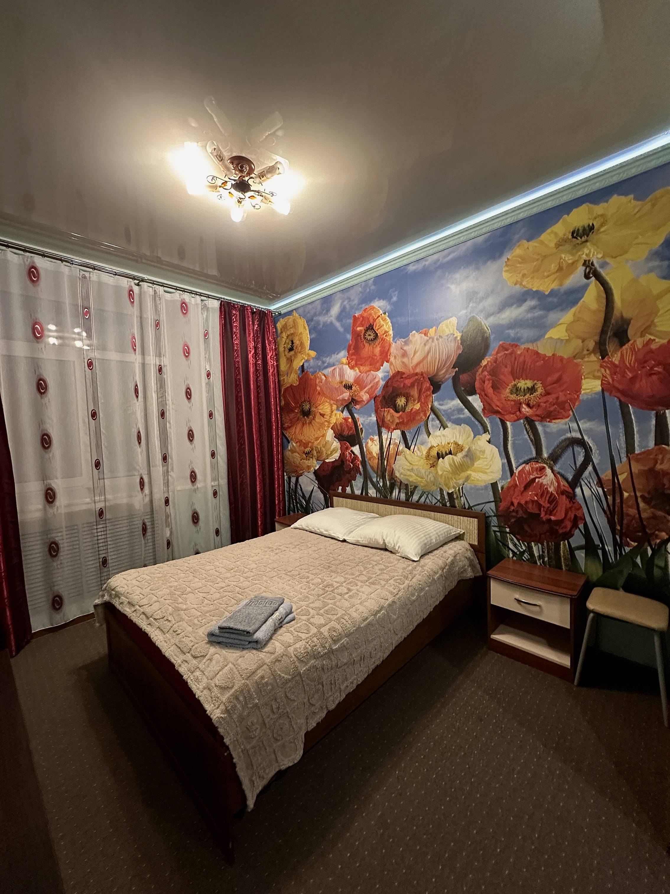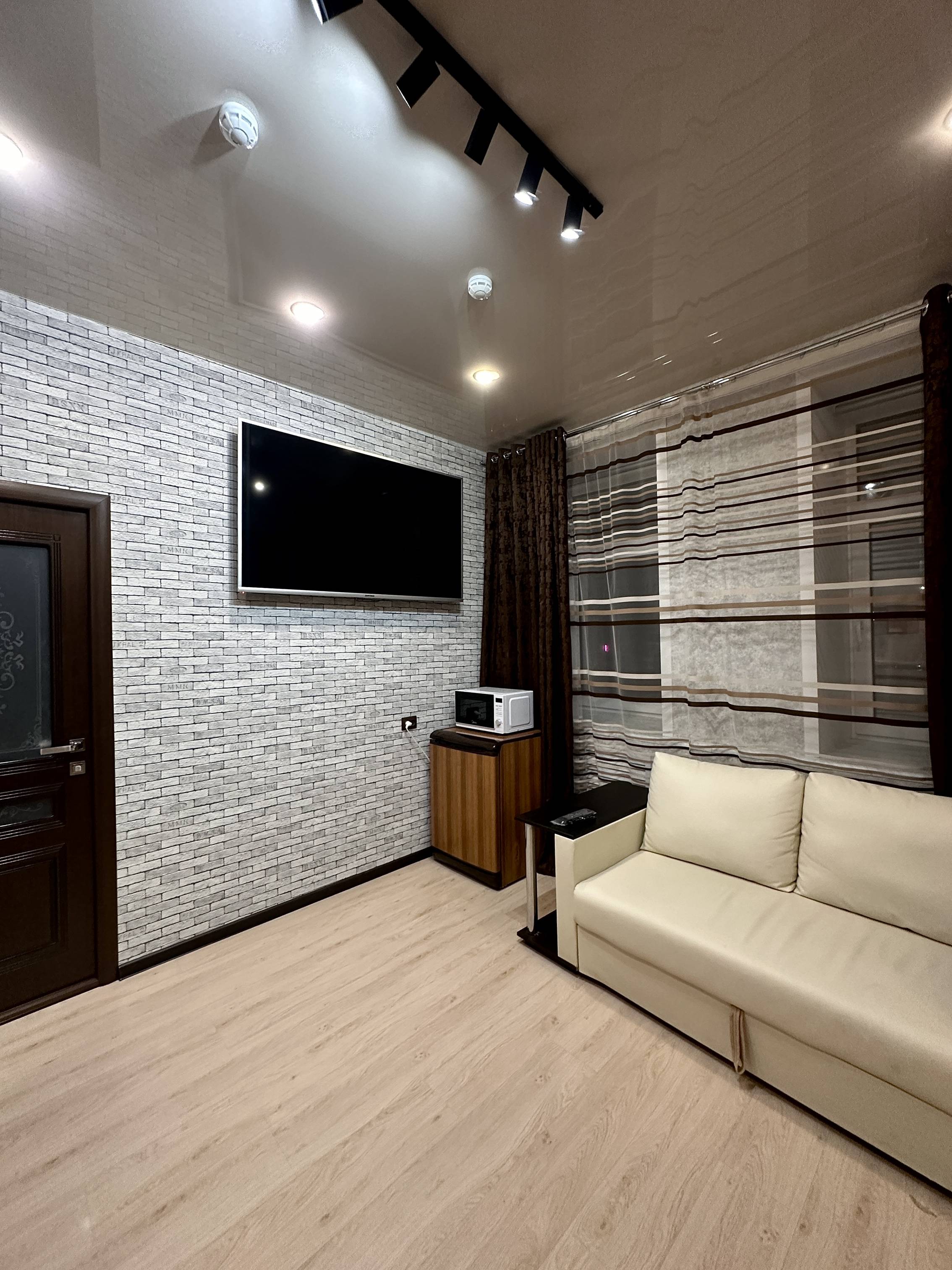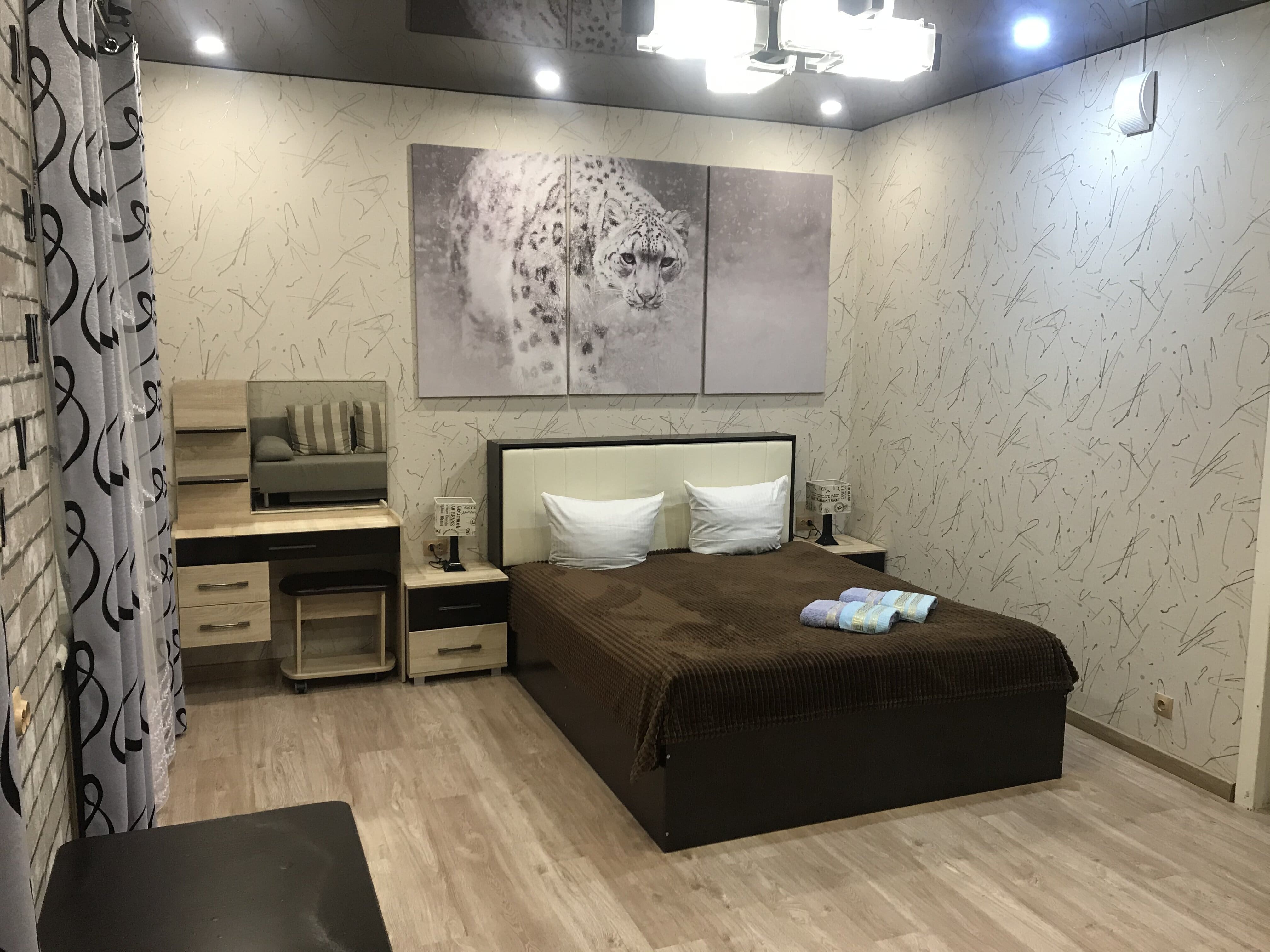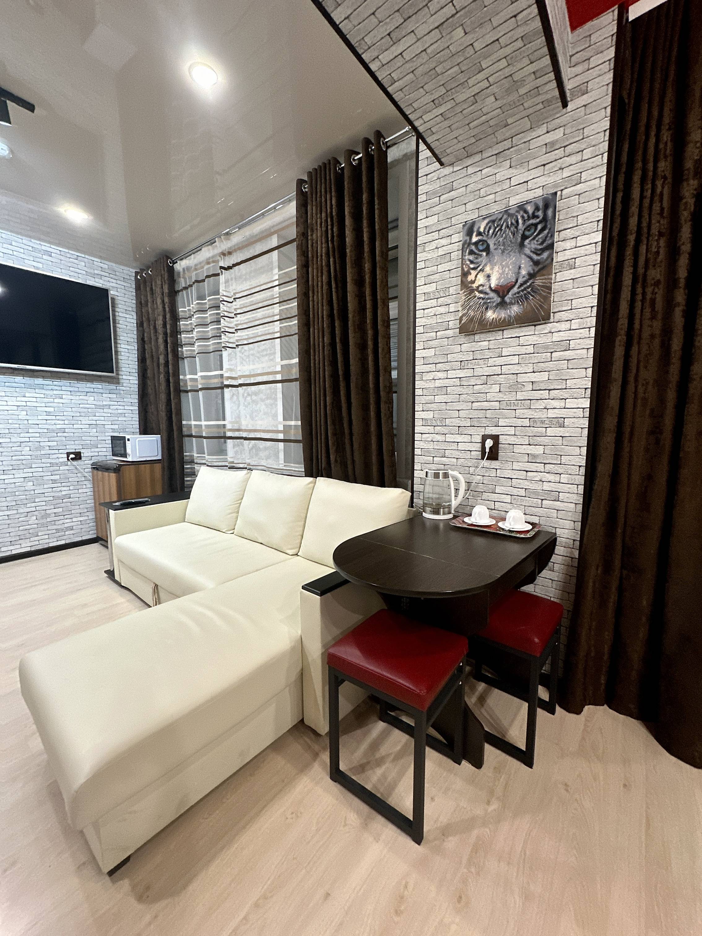 двуспальная кровать, спутниковое телевидение, кондиционер, холодильник, микроволновая печь, ванная комната (ванна), туалет, стиральная машина, гладильная доска, утюг, чайник, фен. Площадь номера 39 м2. Категория: однокомнатный, одноместный, стандартный. Стоимость: от 5 000 руб. в сутки. Завтрак включен |