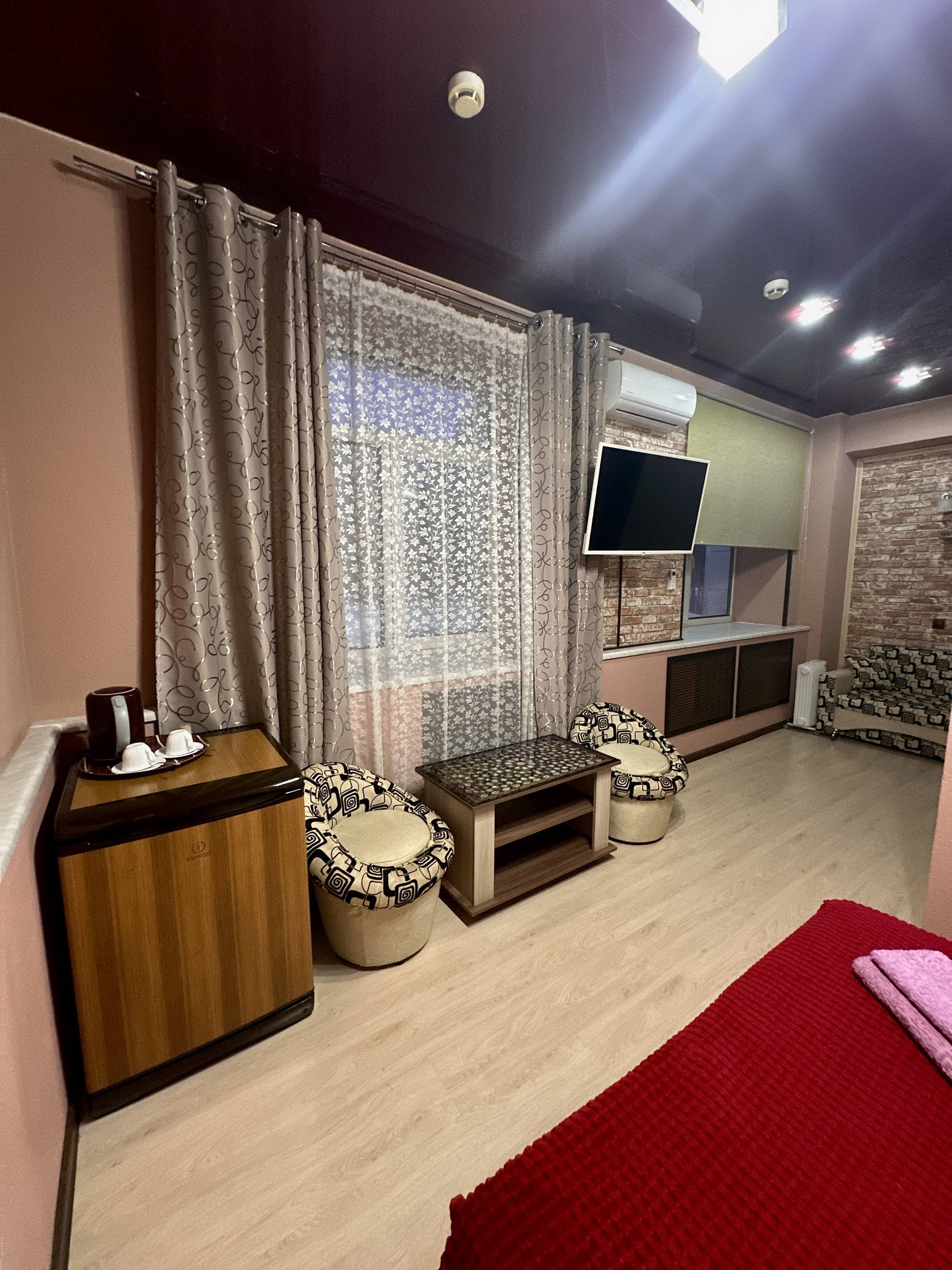 двуспальная кровать, спутниковое телевидение, кондиционер, холодильник, чайник, душевая кабина, туалет, стиральная машина, фен. Площадь номера 23 м2. Категория: однокомнатный, одноместный, стандартный. Стоимость: от 5 000 руб. в сутки. Завтрак включен |